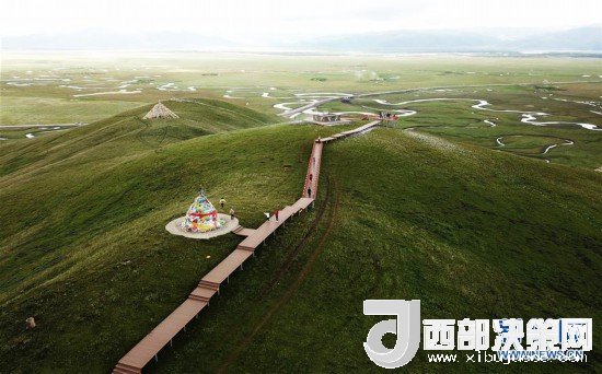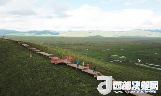 游客在瑪曲縣阿萬倉濕地的觀景步道上游覽(7月31日無人機(jī)拍攝)。 新華社記者 陳斌 攝