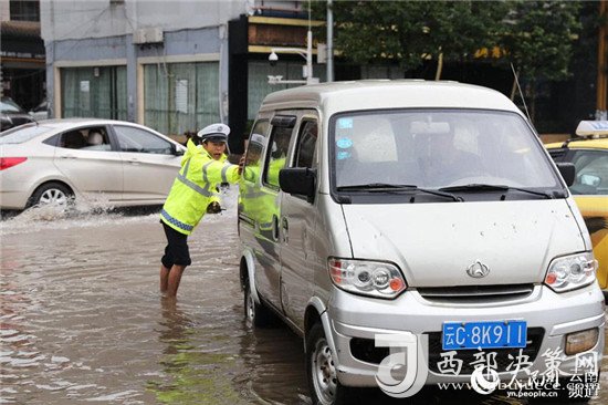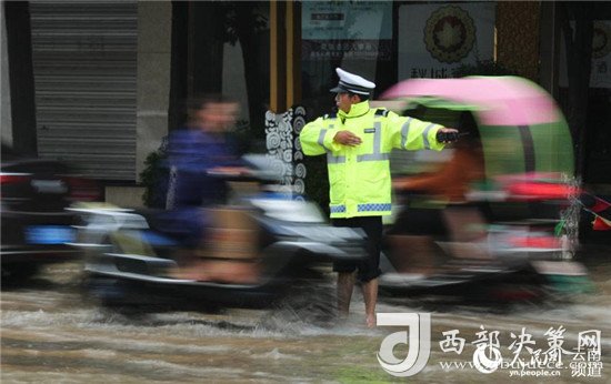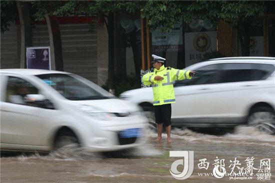 近日,云南昭通大雨導(dǎo)致街道積水嚴(yán)重,昭通中心城市鳳霞路與望海公園環(huán)湖北路交叉口積水最深處達(dá)50公分。一位交警赤腳冒雨在積水中指揮交通幫市民推車(chē)的畫(huà)面被市民抓拍下來(lái),市民表示,交警赤腳在風(fēng)雨中忙碌工作的身影令人難忘感動(dòng)。 (徐前)