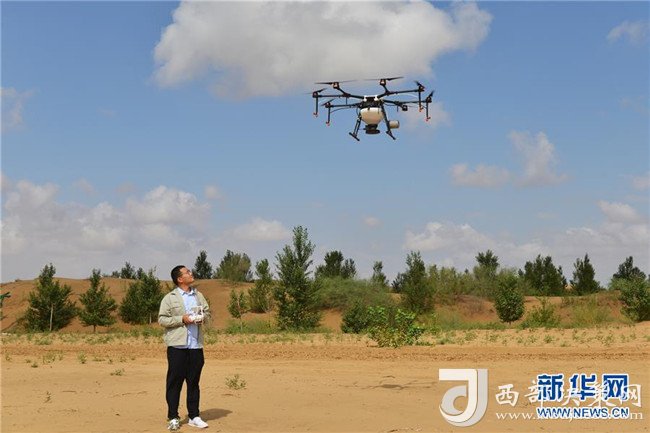 技術(shù)人員在內(nèi)蒙古鄂爾多斯市杭錦旗的庫布其沙漠里操控無人機飛播造林(7月11日攝)。 新華社記者 彭源 攝