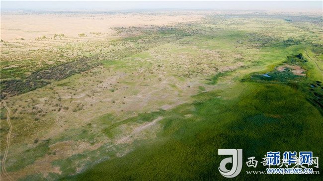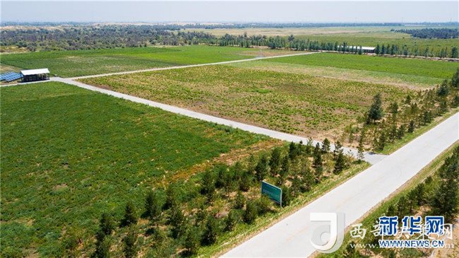 這是內(nèi)蒙古鄂爾多斯市杭錦旗庫布其沙漠中的生態(tài)修復(fù)現(xiàn)狀(7月11日無人機拍攝)。 新華社記者 彭源 攝
