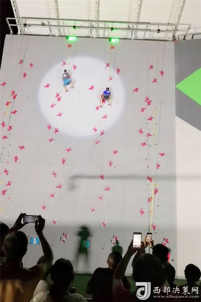 專業(yè)攀巖選手與資深攀巖愛(ài)好者在難度賽道進(jìn)行表演賽