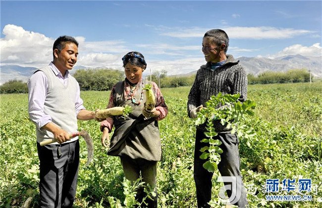8月8日,在邊雄鄉(xiāng)普夏村蘿卜種植基地,白瑪梅朵合作社董事長加措(左)和收獲蘿卜的村民交流。 新華社記者 張汝鋒 攝