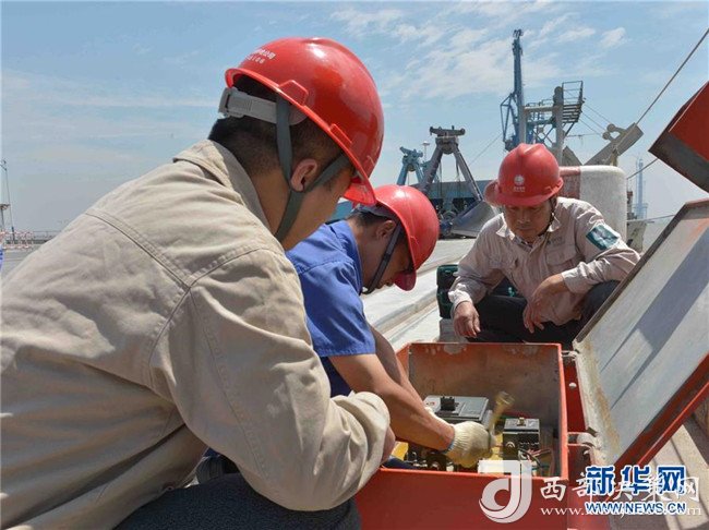 在長(zhǎng)江岸線南通段一處港口碼頭,技術(shù)人員為靠泊貨輪連接岸電系統(tǒng)(6月2日攝)。新華社發(fā)(李存根 攝)