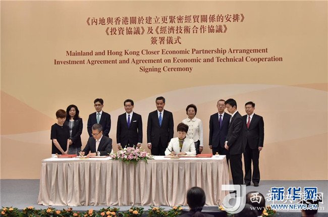 2017年6月28日在香港特區(qū)政府總部拍攝的《內(nèi)地與香港關(guān)于建立更緊密經(jīng)貿(mào)關(guān)系的安排》(CEPA)下的《投資協(xié)議》和《經(jīng)濟(jì)技術(shù)合作協(xié)議》簽約儀式現(xiàn)場(chǎng)。 新華社發(fā)(王璽攝)