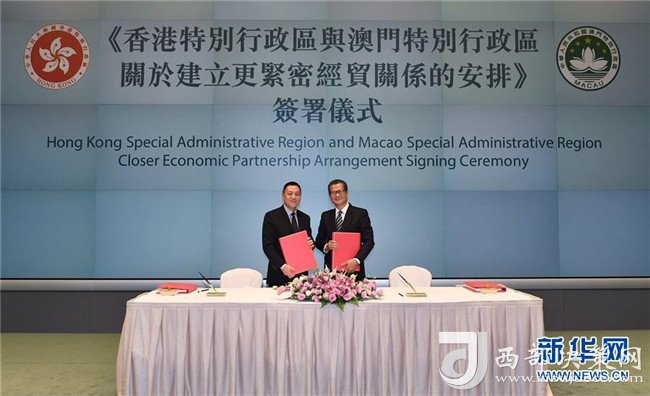 香港特區(qū)政府財(cái)政司司長(zhǎng)陳茂波(右)和澳門(mén)特區(qū)政府經(jīng)濟(jì)財(cái)政司司長(zhǎng)梁維特在香港簽署《香港特別行政區(qū)與澳門(mén)特別行政區(qū)關(guān)于建立更緊密經(jīng)貿(mào)關(guān)系的安排》(2017年10月27日攝)。新華社記者呂小煒攝