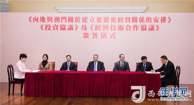 2017年12月18日拍攝的商務(wù)部與澳門(mén)特區(qū)政府《內(nèi)地與澳門(mén)關(guān)于建立更緊密經(jīng)貿(mào)關(guān)系的安排》(CEPA)下的《投資協(xié)議》和《經(jīng)濟(jì)技術(shù)合作協(xié)議》簽約儀式現(xiàn)場(chǎng)。新華社記者張金加攝