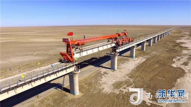 這是位于新疆若羌縣的臺特瑪湖特大橋施工現(xiàn)場(8月17日攝)。8月17日11時58分,在一組架橋機(jī)和運梁機(jī)的協(xié)調(diào)配合下,隨著最后一孔T型梁上的梁體精準(zhǔn)吊裝到位,全長24.558公里、歷時2年建設(shè)的格庫鐵路(青海格爾木——新疆庫爾勒)最長鐵路橋——新疆臺特瑪湖特大橋?qū)崿F(xiàn)合龍。新華社發(fā)