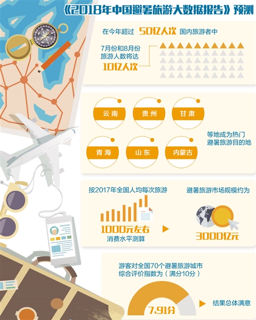 據(jù)中國旅游研究院等單位發(fā)布的《2018年中國避暑旅游大數(shù)據(jù)報告》(下稱《報告》)預測,在今年超過50億人次國內(nèi)旅游者中,7月份和8月份旅游人數(shù)將達10億人次,占全年游客數(shù)量的五分之一。其中,避暑旅游規(guī)模預計占一半,約5億人次。《報告》稱,這一數(shù)字將使中國成為全球最大的避暑旅游市場。