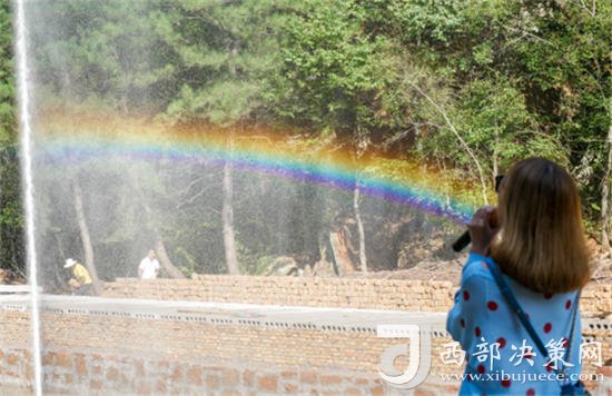 在搖擺橋的旁邊,就是引來眾多體驗(yàn)者的“彩虹喊泉”游玩項(xiàng)目。游客使用話筒大聲呼喊,噴泉會根據(jù)音量的大小“舞蹈”,此時天空中像下起雨一般,雨過天晴,彩虹映入眼簾,浪漫的氛圍便由此營造而來。