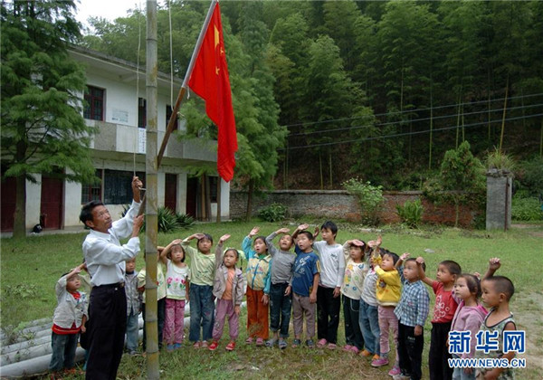 9月4日,在蘆嶺教學(xué)點(diǎn),陳云根(后)和黃文春(前)帶著全校6名學(xué)生升國(guó)旗?,F(xiàn)在學(xué)校操場(chǎng)已經(jīng)鋪上了水泥。新華社記者 宋振平 攝