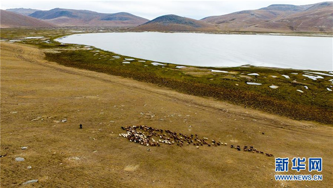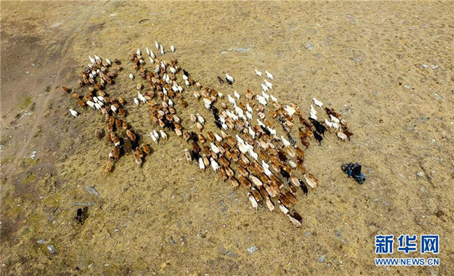 在青河縣查干郭勒鄉(xiāng)薩爾布拉克村,胡賽因·哈力都拉趕著羊群轉場(8月25日無人機拍攝)。新華社記者江文耀攝