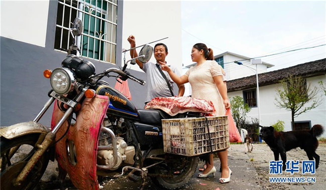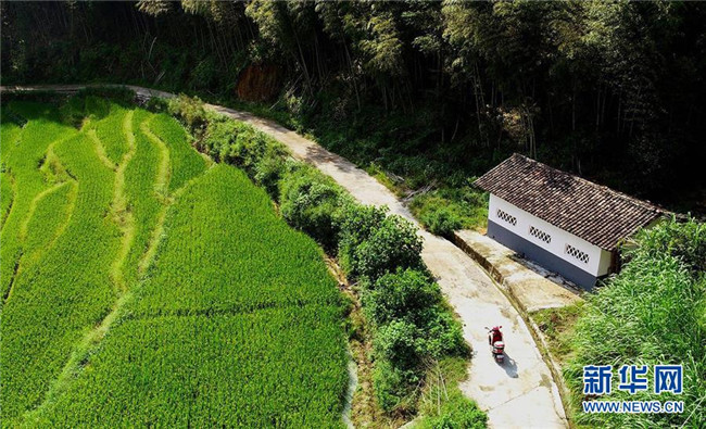 9月4日,陳春英騎摩托車前去領(lǐng)取學(xué)生們的營(yíng)養(yǎng)餐(無人機(jī)拍攝)。新華社記者胡晨歡 攝