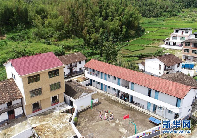 9月4日,陳春英和學(xué)生們?cè)诓賵?chǎng)上玩游戲(無人機(jī)拍攝)。新華社記者胡晨歡 攝