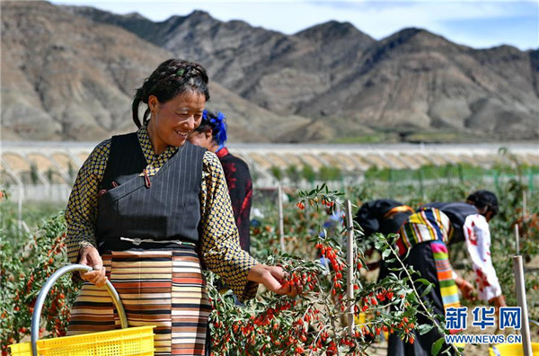 近日,西藏白朗縣萬畝枸杞生態(tài)觀光產(chǎn)業(yè)園進入采摘期。兩年多來,經(jīng)過當?shù)卣推髽I(yè)的共同努力,將原有的沙荒地進行改造,成功栽培7000余畝枸杞目前已果實累累。 新華社記者 張汝鋒 攝