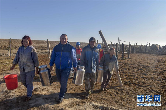 合作社負(fù)責(zé)人哈爾胡(左二)與社員們運(yùn)送駝奶走出駝場(9月14日攝)。 新華社記者 趙戈 攝