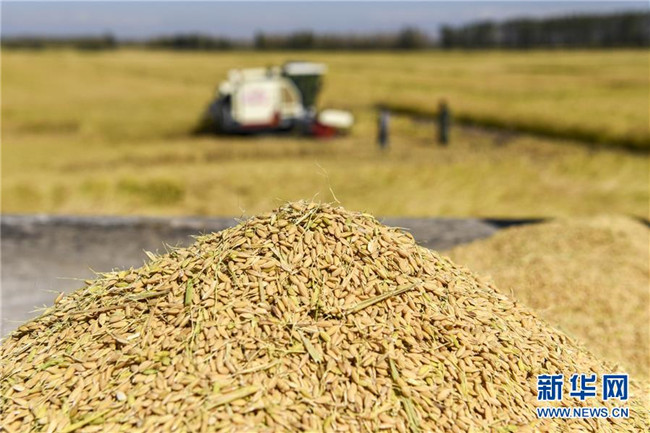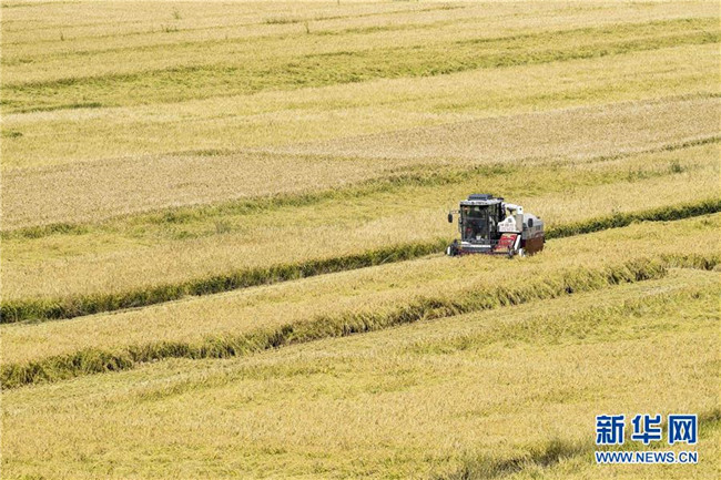 9月26日,收割機(jī)在新疆察布查爾錫伯自治縣納達(dá)齊牛錄鄉(xiāng)的一處稻田收割水稻。眼下,地處新疆伊犁河谷的察布查爾錫伯自治縣約20萬(wàn)畝水稻迎來(lái)收割季。當(dāng)?shù)剞r(nóng)民搶抓農(nóng)時(shí),忙碌在金色田園中。記者 胡虎虎 攝