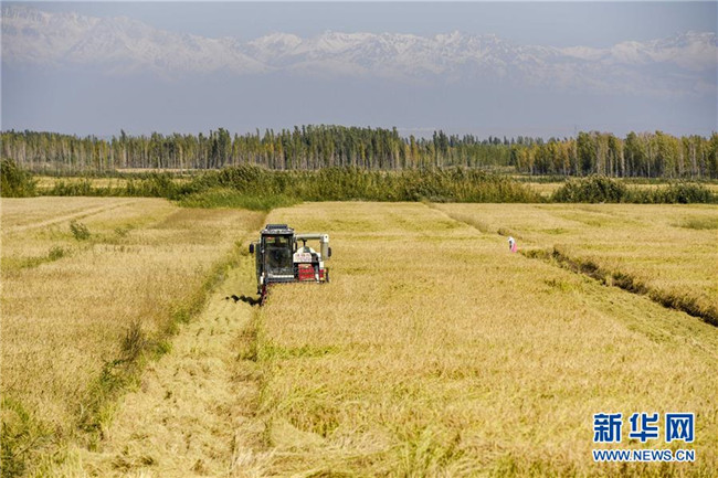 9月26日,收割機(jī)在新疆察布查爾錫伯自治縣種羊場(chǎng)的一處稻田收割水稻。眼下,地處新疆伊犁河谷的察布查爾錫伯自治縣約20萬(wàn)畝水稻迎來(lái)收割季。當(dāng)?shù)剞r(nóng)民搶抓農(nóng)時(shí),忙碌在金色田園中。記者 胡虎虎 攝