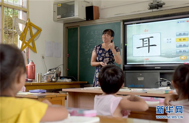 在安徽省黃山市黃山區(qū)烏石鎮(zhèn)清溪中心小學(xué)茶兒垅村教學(xué)點內(nèi),蔣秀蘭老師在給孩子們上語文課(9月7日攝)。今年53歲蔣秀蘭老師從1983年參加工作開始,一直獨自堅守在“一人一校”的單班教學(xué)點,最多的時候獨自一人帶過26名學(xué)生,目前她負(fù)責(zé)兩個年級5個孩子7門課的教學(xué)。 新華社記者 王正忠 攝