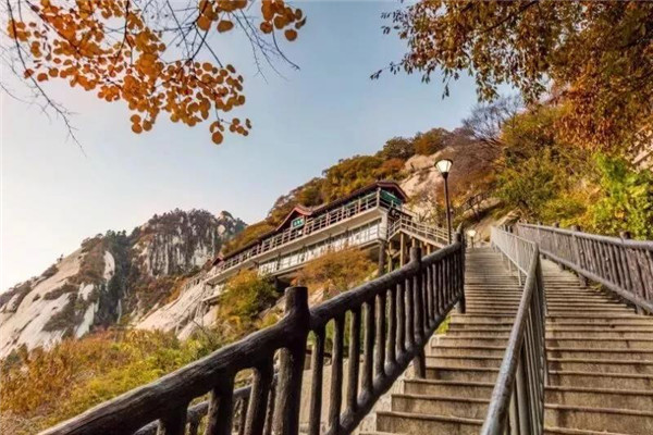 賞紅葉——華山的紅葉是噴薄的,那是一種一瀉千里,從山頂直鋪下山谷,又從山谷延綿更遠(yuǎn)的群山,像瀑布一般,而葉愈遠(yuǎn)處愈紅,紅似火焰耀眼,眼前的則紅黃交錯(cuò),讓人目不暇接。