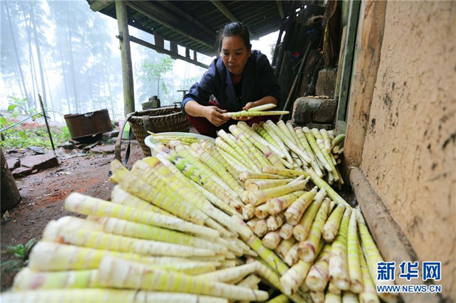 10月14日,在貴州赤水市寶源鄉(xiāng)聯(lián)華村,竹農(nóng)為鮮筍去殼。金秋時(shí)節(jié),貴州省赤水市寶源、兩河口、丙安等鄉(xiāng)鎮(zhèn)種植的5萬(wàn)余畝大竹筍迎來(lái)收獲季。當(dāng)?shù)刂褶r(nóng)加緊采挖竹筍,進(jìn)行加工后外銷。素有“中國(guó)竹子之鄉(xiāng)”的赤水市,現(xiàn)有竹林面積132.8萬(wàn)畝。竹產(chǎn)業(yè)已經(jīng)成為當(dāng)?shù)孛撠氃鍪盏闹饕乐?。(王長(zhǎng)育 攝)