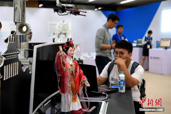 10月13日,第四屆中國“互聯(lián)網(wǎng)+”大學(xué)生創(chuàng)新創(chuàng)業(yè)大賽總決賽在廈門大學(xué)舉行。無人機(jī)、自助售飯機(jī)、人偶互動(dòng)、全息3D智能視頻、機(jī)器人輪椅、3D打印假肢手臂等大學(xué)生研發(fā)設(shè)計(jì)的產(chǎn)品亮相會(huì)場(chǎng),以“90后”為主的創(chuàng)新創(chuàng)業(yè)生力軍已全面發(fā)力,釋放出“青年+創(chuàng)新創(chuàng)業(yè)”的無窮力量。圖為人偶交互機(jī)器人展示。中新社記者 王東明 攝
