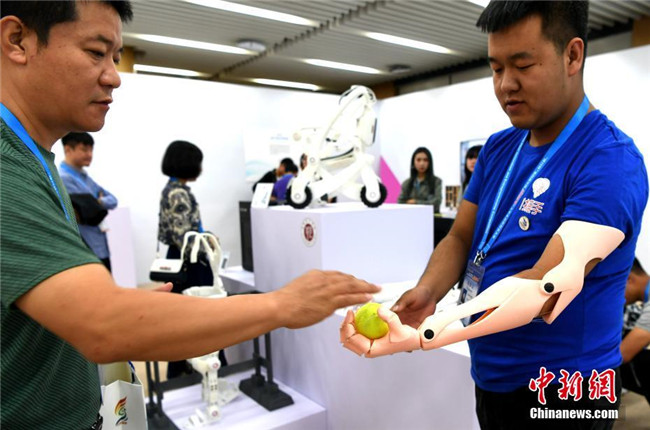 10月13日,第四屆中國“互聯(lián)網(wǎng)+”大學(xué)生創(chuàng)新創(chuàng)業(yè)大賽總決賽在廈門大學(xué)舉行。無人機(jī)、自助售飯機(jī)、人偶互動(dòng)、全息3D智能視頻、機(jī)器人輪椅、3D打印假肢手臂等大學(xué)生研發(fā)設(shè)計(jì)的產(chǎn)品亮相會(huì)場(chǎng),以“90后”為主的創(chuàng)新創(chuàng)業(yè)生力軍已全面發(fā)力,釋放出“青年+創(chuàng)新創(chuàng)業(yè)”的無窮力量。圖為3D打印假肢手臂展示。中新社記者 王東明 攝