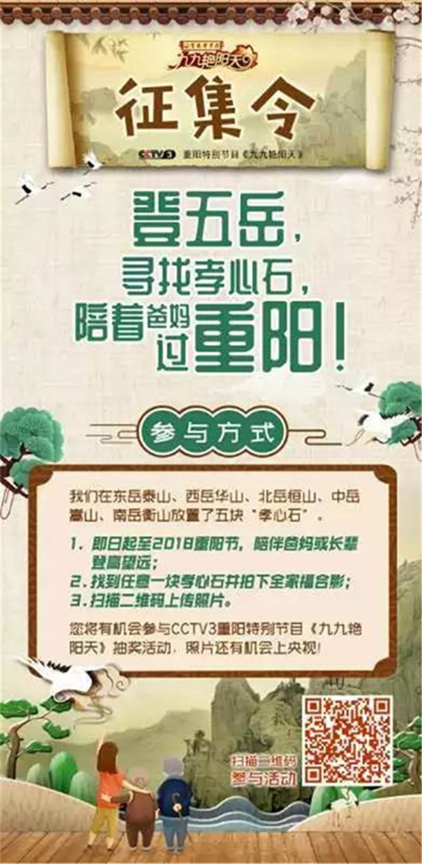 今天是2018年10月17日,農(nóng)歷九月初九重陽節(jié)。由中央廣播電視總臺央視綜藝頻道(CCTV-3)攜手中華五岳名山,共同舉辦的“登五岳 尋找孝心石 陪著爸媽過重陽”暨“福滿華夏 孝行五岳”最美笑容和祝福征集活動正在火熱進(jìn)行當(dāng)中,活動至10月17日重陽節(jié)。只要您陪著爸爸媽媽在五岳任意一塊“孝心石”旁拍下全家福合影,并通過掃碼填寫報名表格,上傳圖片,就可以參加CCTV-3重陽特別節(jié)目《九九艷陽天》的抽獎活動,照片還有機會上央視哦!
