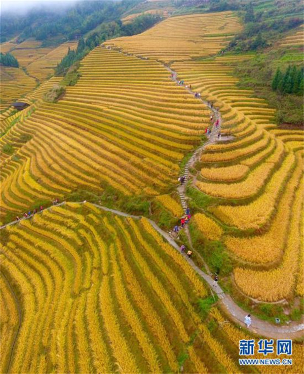 這是10月16日無(wú)人機(jī)拍攝的龍脊梯田秋色。金秋時(shí)節(jié),廣西龍勝各族自治縣龍脊梯田美如畫卷。 新華社記者 黃孝邦 攝