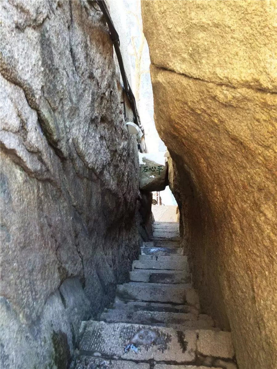 “千尺幢”在華山峪古道“回心石”上,是經(jīng)華山峪登主峰的必經(jīng)之道。這里原為一崖間裂隙,直立70度,后來人們沿隙鑿拓成路,有石階370級,階寬僅容半足,游人登臨時,仰視一線天,俯視若臨深井。