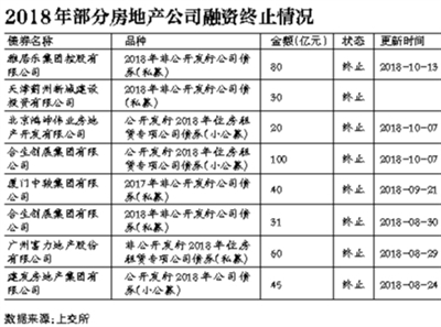 2018年10月份以來,已經(jīng)有多起涉房融資計(jì)劃中止/終止。上交所信息顯示,截至10月25日,已經(jīng)至少有8筆涉房融資計(jì)劃中止或終止審查。諸如,雅居樂擬發(fā)行的80億元非公開發(fā)行公司債券“終止”,該筆公司債曾于今年7月“中止”發(fā)行。合生創(chuàng)展100億規(guī)模的租賃住宅專項(xiàng)公司債券、天津薊州新城建設(shè)投資有限公司30億元的非公開發(fā)行公司債券、北京鴻坤偉業(yè)房地產(chǎn)開發(fā)有限公司20億元的住房租賃專項(xiàng)公司債券“終止”審查。10月份顯示“中止”融資計(jì)劃的有:中山招商-時(shí)代地產(chǎn)購(gòu)房尾款資產(chǎn)支持專項(xiàng)計(jì)劃,擬發(fā)行金額14.3億元;奧園集團(tuán)有限公司非公開發(fā)行2018年住房租賃專項(xiàng)公司債,擬發(fā)行金額10億元,等等。