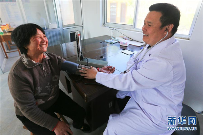 在山東蒙陰縣云夢(mèng)湖生態(tài)區(qū)東汶社區(qū)的農(nóng)村幸福院養(yǎng)老院的醫(yī)務(wù)室,醫(yī)生為老人測(cè)量血壓(10月11日攝)。2016年,東汶社區(qū)將原來(lái)的村兩委大院擴(kuò)建為農(nóng)村幸福院養(yǎng)老院,委派專人負(fù)責(zé)老人們的一日三餐。同時(shí)按照“子女交納、集體補(bǔ)助、社會(huì)捐贈(zèng)、財(cái)政獎(jiǎng)勵(lì)”的模式設(shè)立孝心養(yǎng)老基金,每月定時(shí)發(fā)給貧困老人。新華社記者 王南 攝