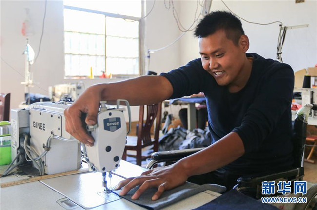 在山東蘭陵縣礦坑鎮(zhèn)朱柳屯村的扶貧車間,貧困戶范加誠(chéng)操作縫紉機(jī)加工布料(10月10日攝)。今年29歲的范加誠(chéng)八年前在建筑工地打零工時(shí)被因意外造成高位截癱。2016年,5萬(wàn)元扶貧貸款為范加誠(chéng)扶貧車間建設(shè)送來(lái)“及時(shí)雨”。一個(gè)月的時(shí)間,他就有了寬敞明亮的加工車間和8臺(tái)嶄新的縫紉機(jī)。新華社記者 王南 攝