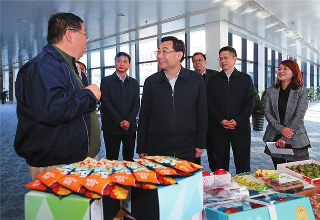 10月31日,省委書記胡和平深入西安市部分民營企業(yè)調(diào)研。圖為他在海升集團果業(yè)總部聽取產(chǎn)品種類、產(chǎn)業(yè)扶貧等情況介紹。 記者 宋紅梅攝