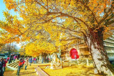 金秋時(shí)節(jié),京城各公園和景區(qū)落葉繽紛,美景如畫(huà)。昨天,北京石刻藝術(shù)博物館內(nèi)的真覺(jué)寺金剛寶座旁,兩株樹(shù)齡近600歲的古銀杏樹(shù)一片金黃,吸引市民觀(guān)賞留影。本報(bào)記者 武亦彬攝