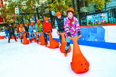 昨天上午,史家小學(xué)分校的學(xué)生們在校內(nèi)的冰場上學(xué)習(xí)滑冰。