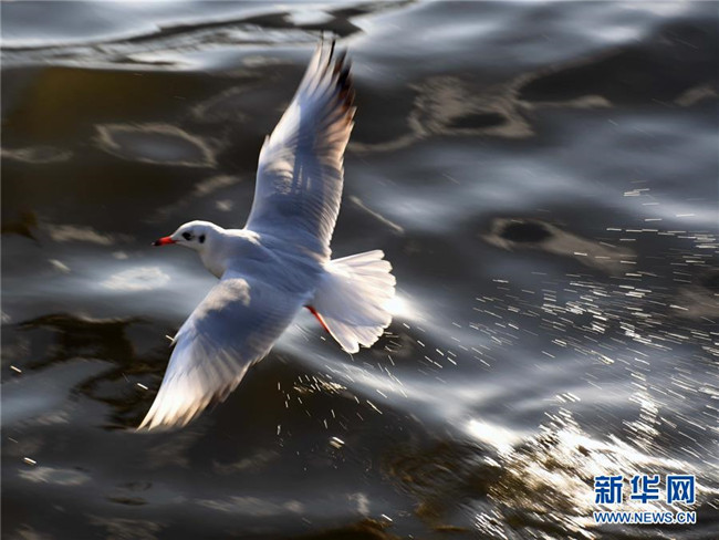 11月19日,一只紅嘴鷗從昆明滇池水面上飛越。 新華社記者楊宗友攝