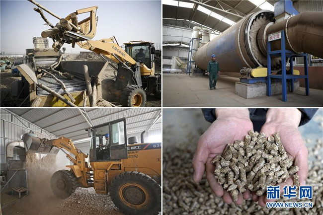 這是由11月27日拍攝的照片組成的拼版照片:左上圖為粉碎設(shè)備將秸稈、廢棄木材初步粉碎;右上圖為秸稈、廢棄木材經(jīng)過(guò)粉碎后進(jìn)行烘干處理;左下圖為工作人員用鏟車(chē)將初步粉碎的渣料填入機(jī)器進(jìn)行處理;右下圖為秸稈、廢棄木材制成的生物質(zhì)顆粒燃料。