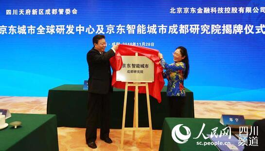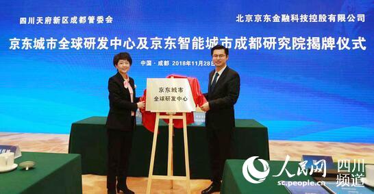 成都市副市長劉筱柳和京東集團副總裁、京東數(shù)字科技首席數(shù)據(jù)科學(xué)家、京東智能城市研究院院長鄭宇教授共同為京東城市全球研發(fā)中心揭牌(圖片由主辦方提供)