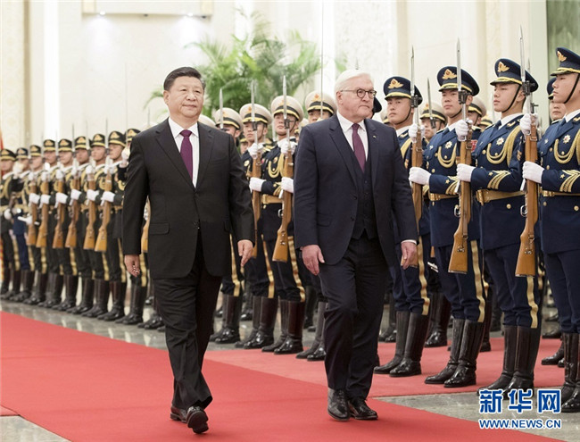 國家主席習(xí)近平10日在人民大會(huì)堂同德國總統(tǒng)施泰因邁爾舉行會(huì)談。兩國元首一致同意,加深互信,合作共贏,推動(dòng)中德全方位戰(zhàn)略伙伴關(guān)系繼續(xù)深入發(fā)展,讓中德合作取得更多有利于兩國和兩國人民、有利于世界和平與繁榮的成果。