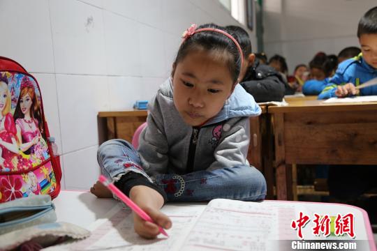 放學(xué)回家,游成雪用腳寫作業(yè)。陳本強(qiáng) 攝