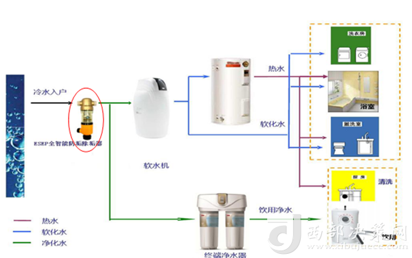 通常安裝在進水管道水表后,是對全屋用水的第一道過濾、防垢設備??梢宰柚顾w中成垢離子的結(jié)合,并且過濾自來水中的泥沙、鐵銹、大顆粒物質(zhì)。