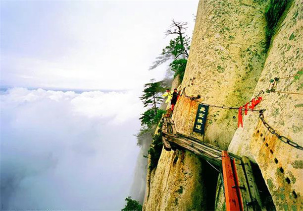 千尺幢位于回心石之上,是華山第一險(xiǎn)境。山幢壁直立,其間僅容二人上下穿行。兩邊鐵鏈垂直下垂,坡度為70°。從上到下共有370多個(gè)臺(tái)階,皆不滿足寬。