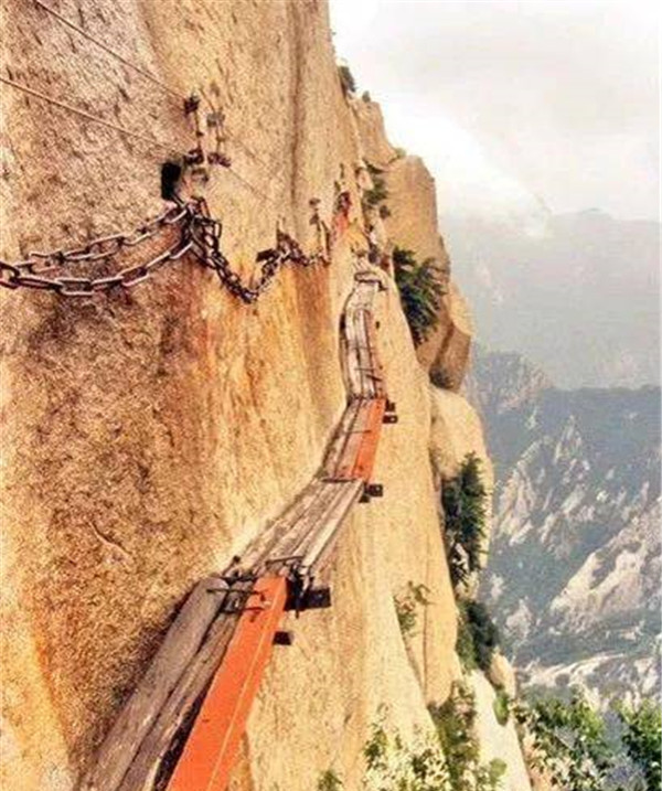 長空棧道位于華山南峰東側(cè)山腰,在約2160米垂直的崖壁上鑿洞、插楔、鋪板搭制而成的“長空棧道”,腳下便是萬丈深淵,勇敢的人如履平地,稍畏懼者便是膽戰(zhàn)心驚,屏氣挪步。