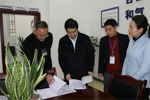 在張壩司法所,劉志誠(chéng)察看了社區(qū)矯正宣告室、人民調(diào)解室、法律援助工作站,仔細(xì)翻閱相關(guān)資料,關(guān)切詢問(wèn)工作人員司法所人民調(diào)解、法律援助等業(yè)務(wù)工作情況及對(duì)司法行政工作意見建議。走進(jìn)龍馬潭區(qū)誠(chéng)達(dá)公證處,映入眼簾的標(biāo)識(shí)標(biāo)牌讓劉志誠(chéng)對(duì)該處的黨建引領(lǐng)和文化建設(shè)表示滿意,他親切地與公證員交流互動(dòng),了解公證處黨建促發(fā)展、公證參與司法輔助、“最多跑一次”、等工作情況。劉志誠(chéng)指出,公證服務(wù)是黨委政府為民服務(wù)的形象和代表,要把人民群眾滿不滿意作為檢驗(yàn)公證工作成效的標(biāo)準(zhǔn),全心全意為群眾做好法律服務(wù)。在自貿(mào)區(qū)在建瀘州市公共法律服務(wù)中心,劉志誠(chéng)指出,公共法律服務(wù)中心是服務(wù)群眾的窗口,在設(shè)計(jì)規(guī)劃中要拓寬思路,整合法律服務(wù)功能,從便民利民出發(fā),從群眾的需要做起,將公共法律服務(wù)中心建成群眾滿意、企業(yè)滿意、黨委政府滿意的標(biāo)準(zhǔn)化服務(wù)平臺(tái)。