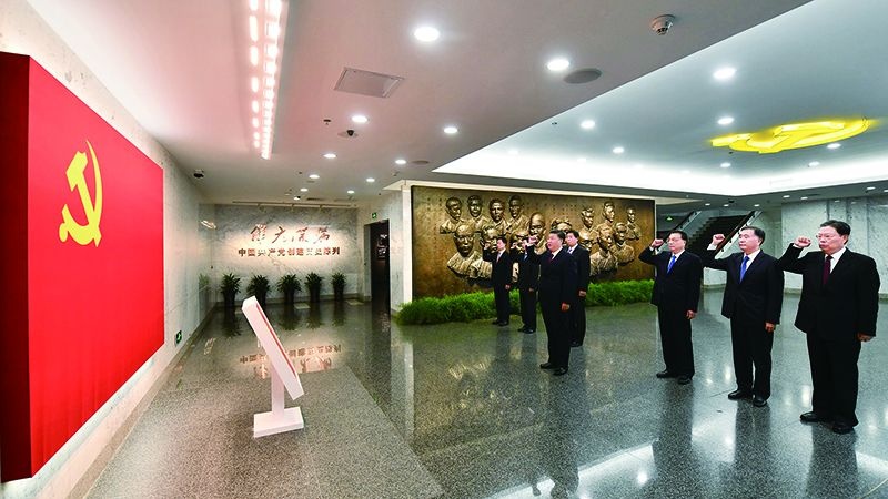 2017年10月31日,中共中央總書記、國家主席、中央軍委主席習(xí)近平帶領(lǐng)中共中央政治局常委李克強(qiáng)、栗戰(zhàn)書、汪洋、王滬寧、趙樂際、韓正,瞻仰上海中共一大會(huì)址和浙江嘉興南湖紅船。這是31日上午,在上海中共一大會(huì)址紀(jì)念館,習(xí)近平帶領(lǐng)其他中共中央政治局常委同志一起重溫入黨誓詞。 新華社記者 李濤/攝