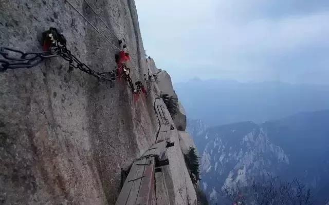長(zhǎng)空棧道:長(zhǎng)空棧道位于華山南峰東側(cè)山腰,是華山派第一代宗師元代高道賀志真為遠(yuǎn)離塵世靜修成仙,在萬(wàn)仞絕壁上鑲嵌石釘搭木椽而筑。棧道上下皆是懸崖絕壁,鐵索橫懸,由條石搭成尺許路面,下由石柱固定,游人至此,面壁貼腹,屏氣挪步,被喻為“華山第一天險(xiǎn)”。