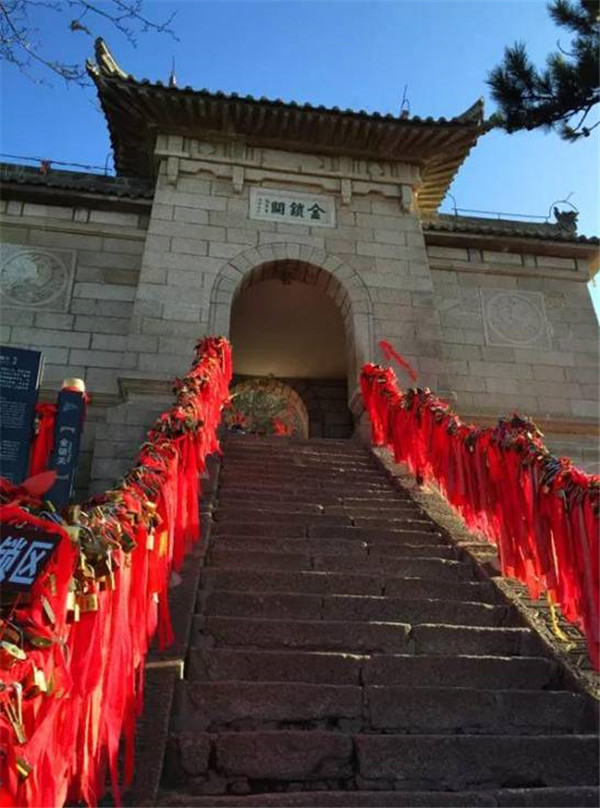 金鎖關(guān)——登山路兩側(cè)鐵索上情侶鎖,重重疊疊,紅繩彩線迎風搖曳,在這里,鎖住你們對愛情的誓言,表達隊愛情忠貞!