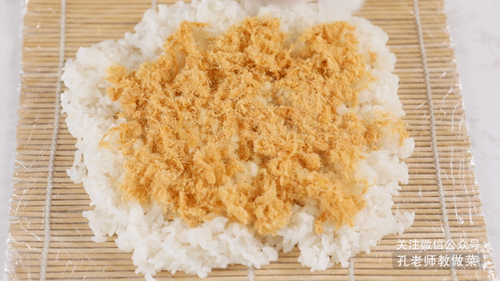 4.竹簾上鋪一層保鮮膜,將蒸好的米飯趁熱盛出鋪在竹簾上,竹簾邊緣留出2cm左右的空隙。(米飯趁熱時(shí)操作才不會粘手,如果有點(diǎn)粘手的話,可以將雙手粘少許涼白開水操作。)