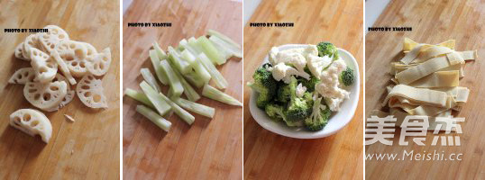 主料:雞翅中6個 大蝦6個 木耳60克 藕100克 豆皮100克 青筍200克 鮮香菇100克 西蘭花100克 菜花100克 金針菇1小把