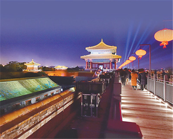觀眾入場前,可觀賞午門城樓及東、西雁翅樓在燈光映照下的壯美雄姿。自午門入場后,首先觀賞點(diǎn)亮后的太和門廣場,隨后由午門西馬道登午門城樓,參觀“紫禁城里過大年”展覽,在東雁翅樓欣賞中央民族樂團(tuán)琵琶演奏家趙聰及其團(tuán)隊(duì)的演奏。結(jié)束午門展廳參觀后,觀眾沿著由紅燈籠點(diǎn)綴的城墻步行至東南角樓,觀看虛擬現(xiàn)實(shí)影片《角樓》,隨后來到東華門城樓,參觀“營造之道——紫禁城建筑藝術(shù)展”。當(dāng)走過近千米長的布滿紅燈籠的故宮東城墻時(shí),可以看到臨近城墻西側(cè)的部分古建筑也被點(diǎn)亮,聆聽暢音閣戲樓傳來的戲曲聲。到達(dá)東北角樓后,觀眾步行至神武門,在這一區(qū)域可以觀賞到城墻南北兩側(cè)通過藝術(shù)燈光投影于建筑屋頂上的《千里江山圖》等作品,從而產(chǎn)生人在畫中游的感覺。離開神武門城樓后,神武門外東、西兩側(cè)的角樓餐廳和角樓咖啡靜候光臨,從而結(jié)束此次“上元之夜”文化活動。
